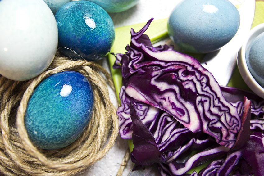 Необхідно завчасно зварити яйця, а вже потім готувати суміш. Можна зробити або сік або відвар із капусти. Треба подрібнити капусту у блендері та вичавити сік або зварити її у воді до насиченого кольору. Потім опустити яйця на ніч і на ранок отримати крашанки ніжного небесного кольору.