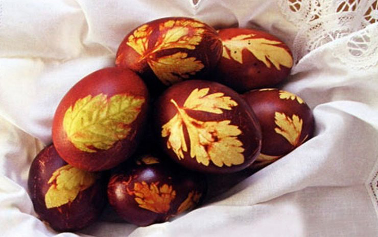 Листочки пряних трав на кшталт м'яти, кінзи, петрушки, або що у вас знайдеться вдома, просто притисніть до яйця, обгорніть марлею, або капроном, міцно зав'яжіть, щоб листок не зліз, та опустіть яйця в будь-який розчин, приготований із додаванням натурального барвника.