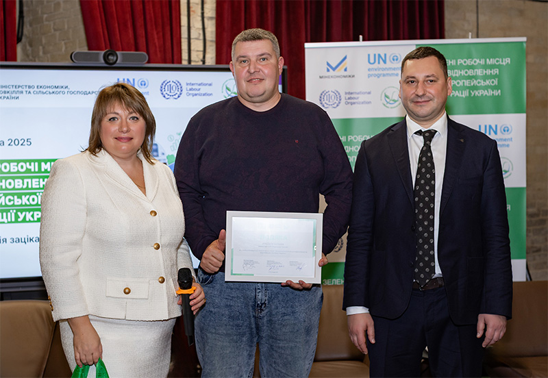 Вручення подяки від проєкту Павлу Кузьменко, меру м. Охтирка – вручають Світлана Берзіна , президент ВГО "Жива планета", Ігор Зубович, заступник Міністра економіки, довкілля та сільського господарства України і Дземал Ходжич, головний технічний радник представництва Міжнародної організації праці в Україні