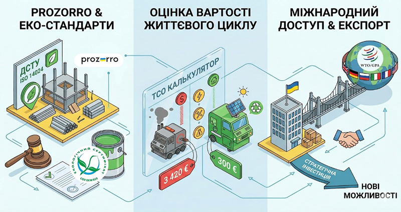 Закон України «Про публічні закупівлі» дає змогу враховувати вимоги до екологічних характеристик і нецінові критерії, зокрема щодо захисту довкілля та енергоефективності. Це відкриває нові можливості для компаній, які інвестують в сталі рішення, екологічну сертифікацію, дозволяючи їм отримати конкурентну перевагу навіть при більш високій ціні.
