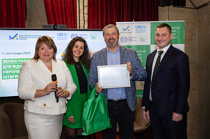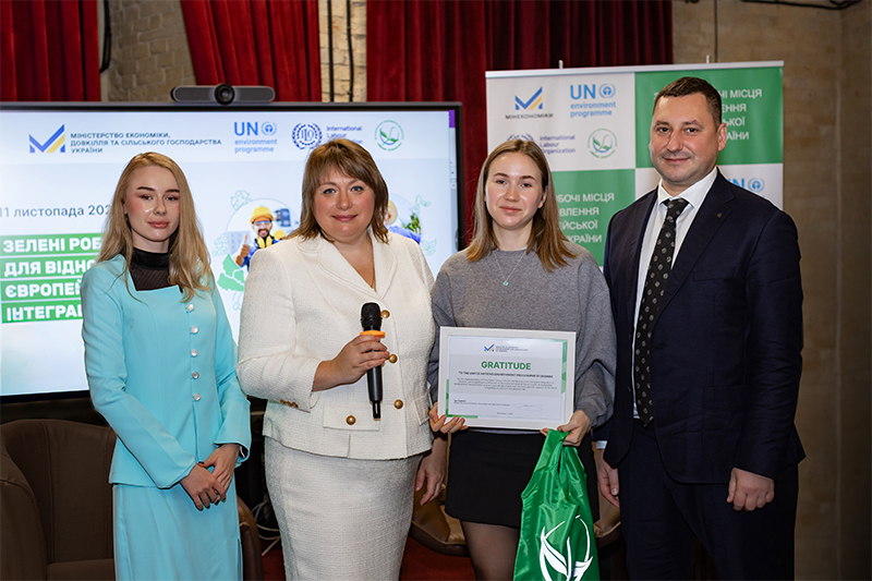 Вручення подяки від Міністерства економіки, довкілля та сільського господарства України - команді ЮНЕП за реалізацію проєкту «Зелені робочі місця для відновлення та європейської інтеграції України» і вагомий внесок у впровадження принципів сталого розвитку, просування зелених підходів у післявоєнному відновленні та підтримку соціальної інтеграції ветеранів у мирне життя