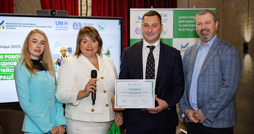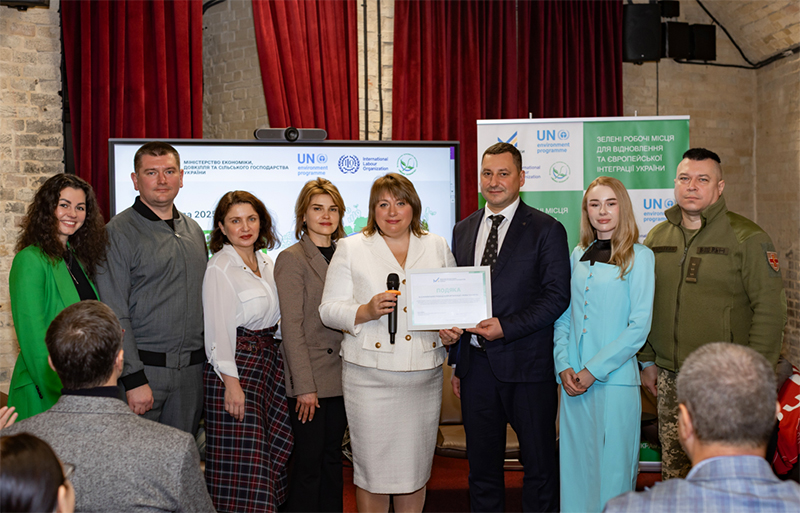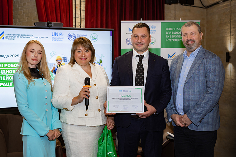 Вручення подяки від Міністерства економіки, довкілля та сільського господарства України - команді ЮНЕП за реалізацію проєкту «Зелені робочі місця для відновлення та європейської інтеграції України» і вагомий внесок у впровадження принципів сталого розвитку, просування зелених підходів у післявоєнному відновленні та підтримку соціальної інтеграції ветеранів у мирне життя